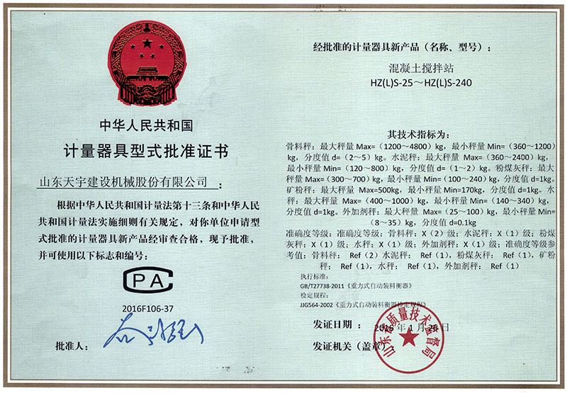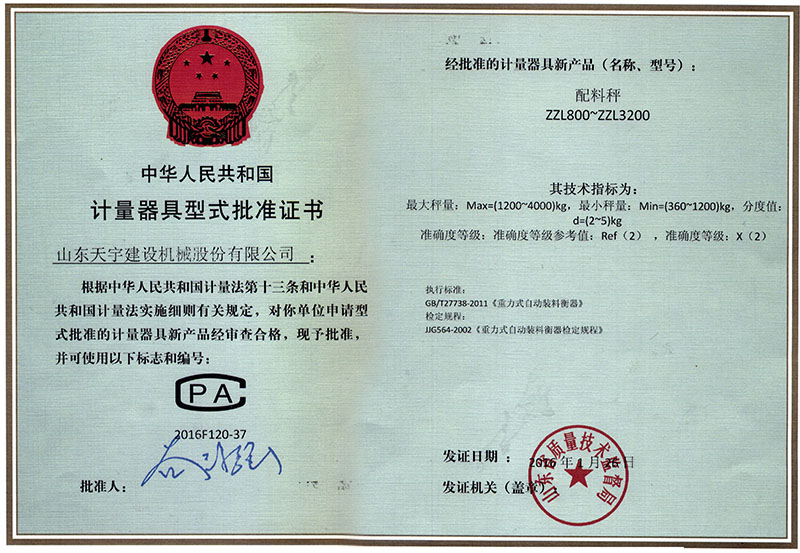 計(jì)量器具形式批準(zhǔn)證書(shū)